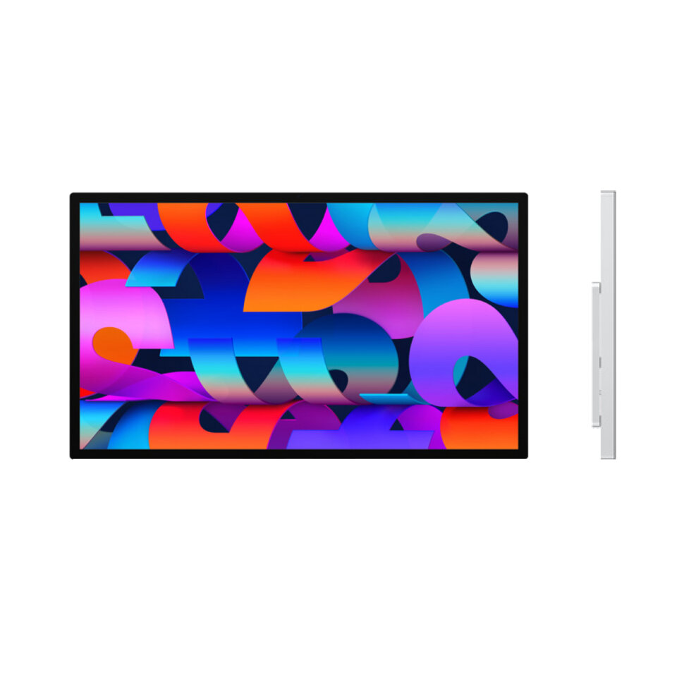 - Нанотекстурное стекло: специальная матовая обработка уменьшает отражения и блики, сохраняя точность цветов — идеальное решение для ярко освещённых помещений и креативных студий.