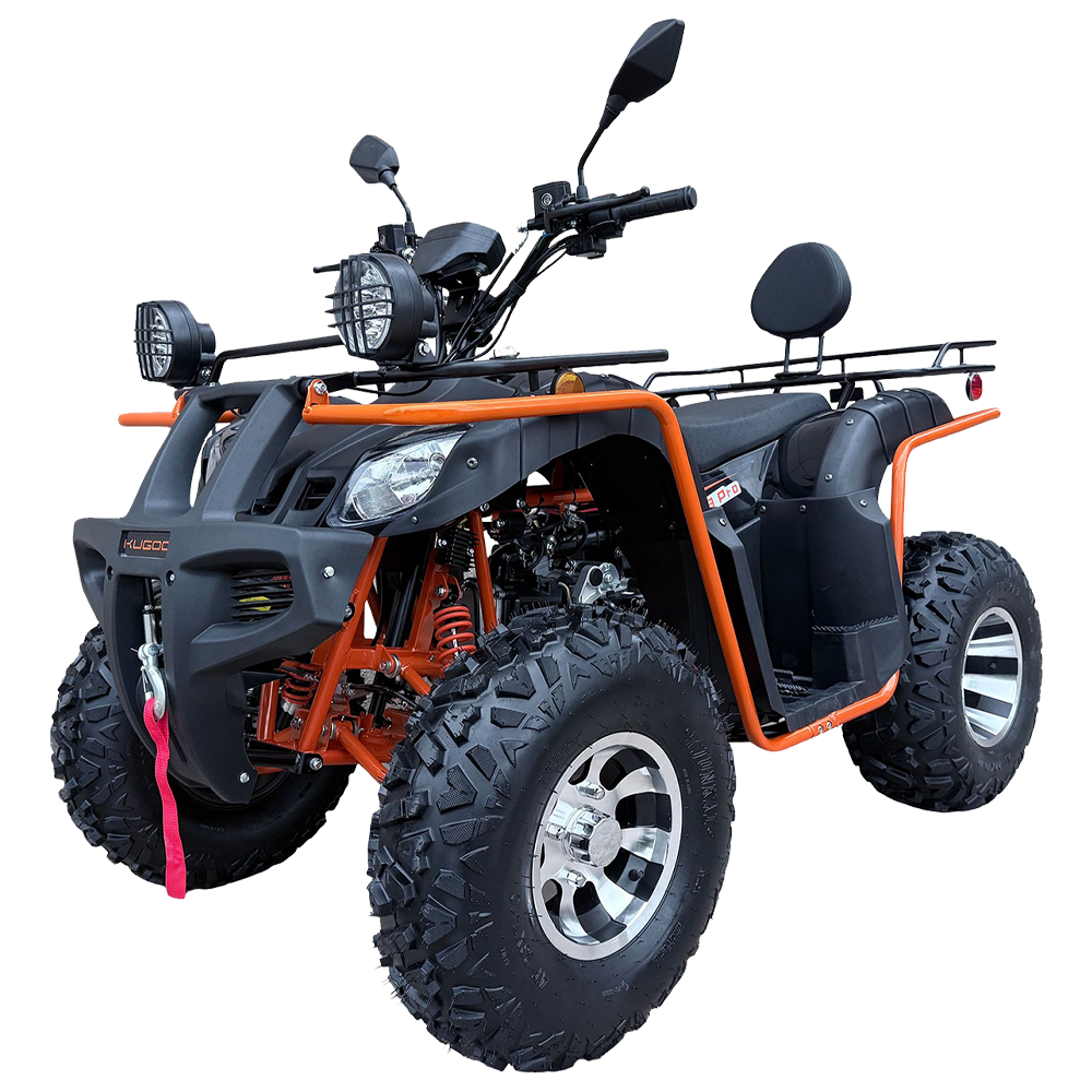 Kugoo K3 Pro — утилитарный квадроцикл для загородных маршрутов, грунтовок и лёгкого бездорожья. Модель оснащается 4-тактным бензиновым двигателем 200 см³, цепным приводом и гидравлическими дисковыми тормозами спереди и сзади. Топливный бак 5,5 л позволяет дольше оставаться “в пути”, а максимальная скорость заявляется до 65 км/ч (зависит от условий эксплуатации).
